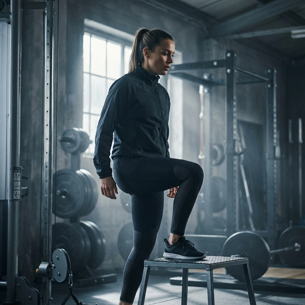 Key technical points include selecting appropriate step height (typically knee-high or slightly below), maintaining knee alignment with the toe, and achieving full hip extension at the top position. Progressive overload occurs through added resistance, increased step height, or tempo modifications.